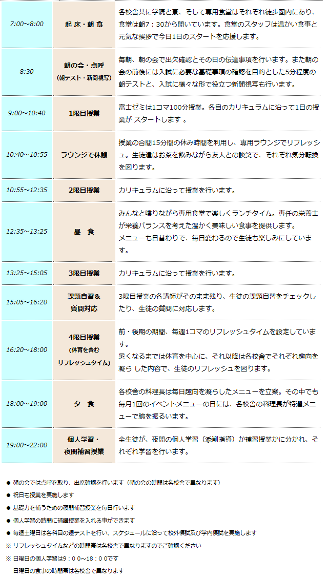 富士ゼミでは個々のカリキュラムに沿って授業が行われます。夜は午後10:00まで学院で学習が出来、個人学習担当の講師にはいつでも質問が出来ます。