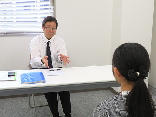 セミナー後の模擬面接指導で多くの課題が見つかったので、月1回のペースで面接指導を行う。まずは学院独自の面接ノートを用いながら、自己分析する所からスタート。そこで「何故医師になりたいのか」、「何故医師でなければダメなのか」、「将来どんな医師になりたいのか」を再確認。その結果、自分の思い、考えをストレートに面接官に伝えること、自分自身をしっかりとアピールすることが出来るように改善。センター試験終了後には具体的な大学を想定し、「何故その学校に入りたいのか」を徹底的に分析し、自信を持って本番を迎える。