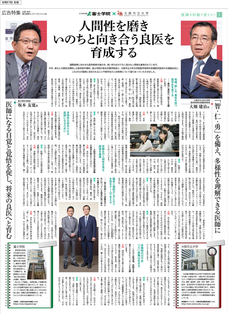 「朝日新聞大阪本社版2019年6月30日(日)付で富士学院坂本学院長と大阪市立大学医学部長 大畑 健治先生が医師を目指す若者たちへ「人間性を磨きいのちと向き合う良医を育成する」というテーマで対談を行い、その内容が掲載されました。詳しい内容は「寺子屋朝日」でもご覧になれます。
