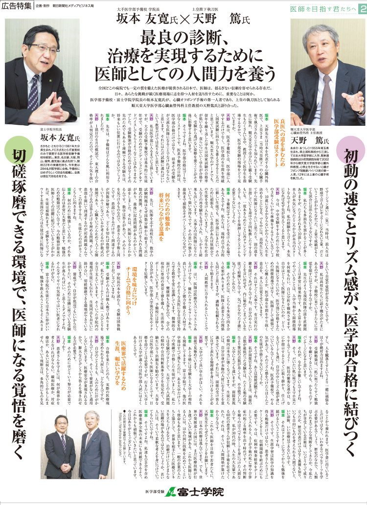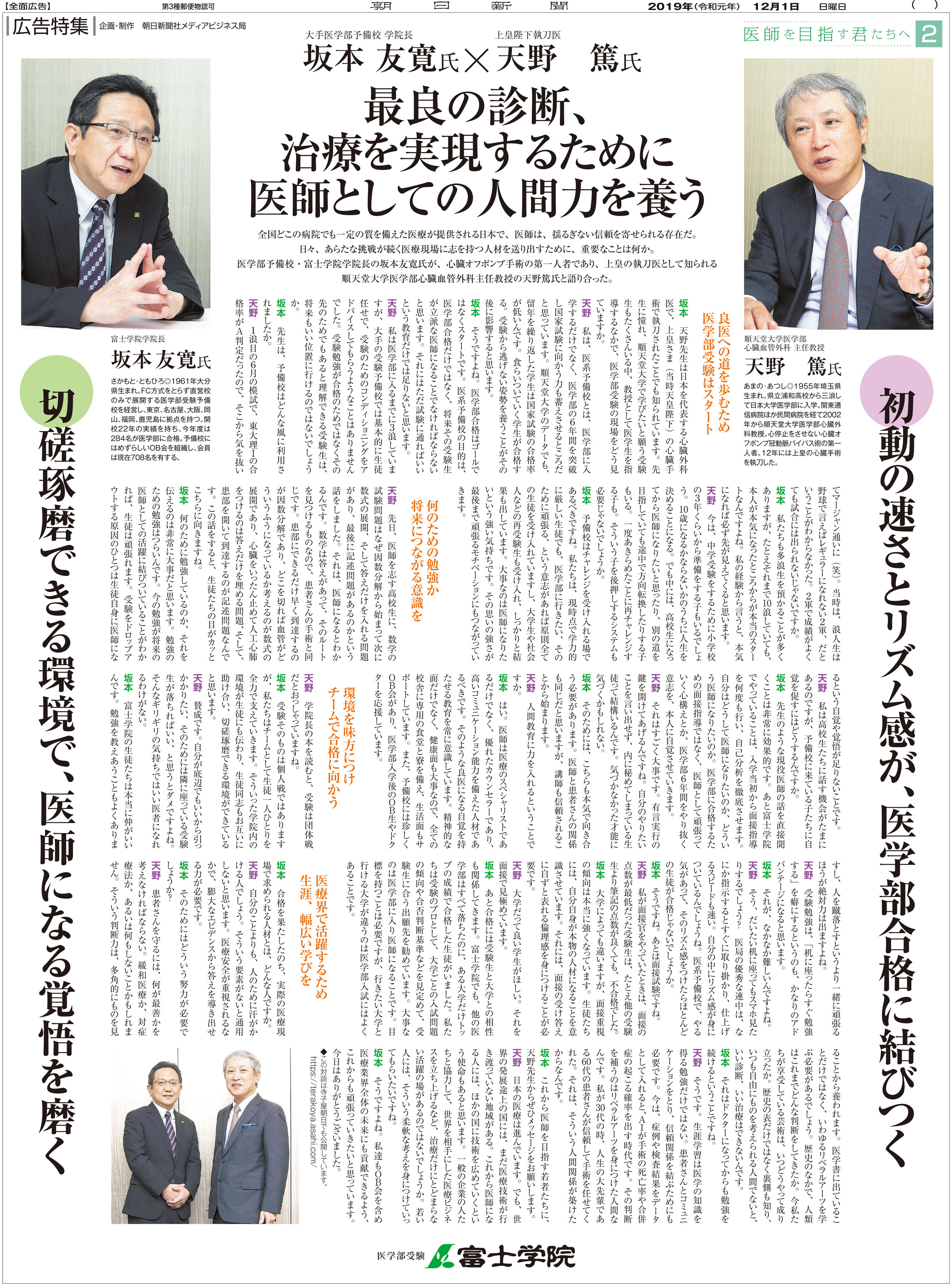 「朝日新聞大阪本社版2019年12月1日(日)付で富士学院坂本学院長と上皇陛下執刀医で順天堂大学医学部心臓血管外科主任教授 天野 篤先生が医師を目指す若者たちへ「最良の診断、治療を実現するために医師として人間力を養う」というテーマで対談を行い、その内容が掲載されました。記事の詳細は以下からご覧いただけます。