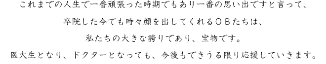 私たちの願いは、それぞれの卒院生が日本の社会に貢献できるドクターに育つこと。そして、がんばるドクターを守り、応援していくことが、私たちの役割であり、使命だと考えています。そのために富士学院では、卒院生たちと共に富士OB会を設立し、卒院後もできうる限りの応援をしたいと考え、行動しています。医療業界を取り巻く環境が大きく変化している今、今後も良き相談窓口となれるようOB会事務局を中心に、応援体制をさらに充実させるべく全力で整備に取り組んでいきます。