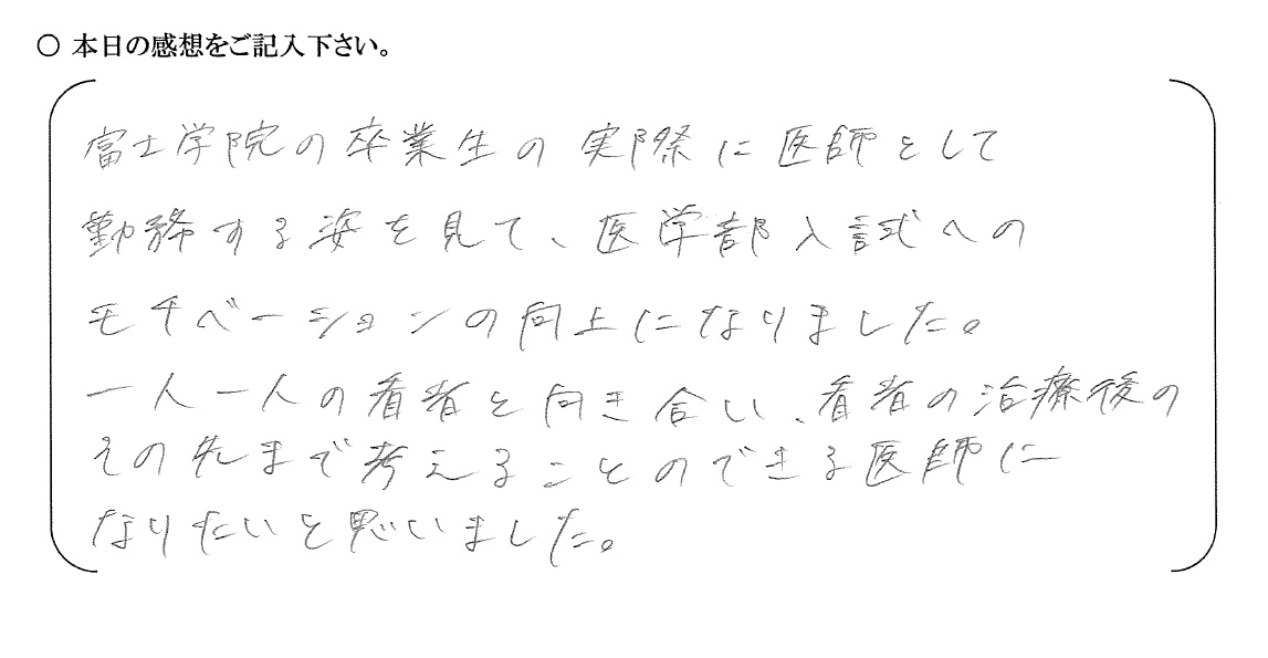 医学部受験は「医師になる」ための受験です。「医学部に入る」ことが目標となってしまうと燃え尽き症候群になり、厳しい医学教育カリキュラムに耐えることはできません。富士学院では〝何のための勉強なのか〟〝医師になるということはどういうことなのか〟など『医師になる』という自覚と覚悟を促すために年間を通し様々な取り組みを行っています。