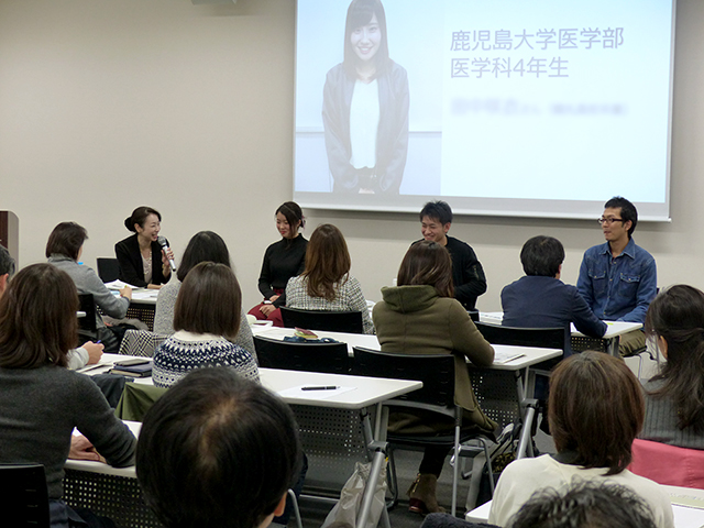 第三部からは富士学院OB・OGの現役医大生によるトークセッションでした。富士学院を卒院したOBたち3名(福岡大学医学部医学科1年のC・Nさん、Y・C君、久留米大学医学部医学科1年のK・O君)に登壇してもらい、それぞれ「合格までの道のり」「高校での生活」「合格の要因」「現役合格するためのアドバイス」などについて語ってもらいました。また、当日はスケジュールの都合で登壇できなかった鹿児島大学医学部医学科4年のS・Tさんにも写真とアンケート形式で参加していただきました。