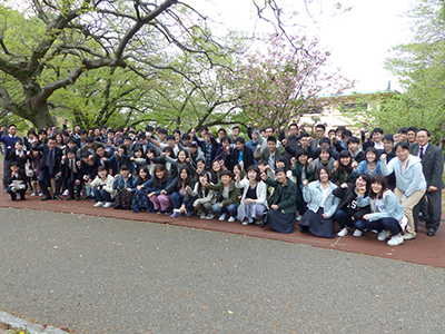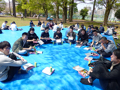 オリエンテーション終了後、学院の近くにあり、きれいな桜が咲いている山王公園に移動し、生徒・講師の先生方・職員みんなで記念撮影を行い、一緒にお弁当を食べました。皆、緊張もほぐれ、笑顔で楽しそうに和気藹々と食事をしていました。