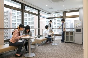 授業の合間は専用ラウンジで15分の小休憩。生徒達はお茶を飲みながら友人と談笑したり、それぞれ次の授業をしたいと、生徒毎に休み時間を活用しています。