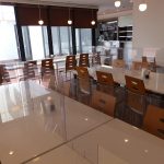 手指消毒剤とマスクは学院として早い段階で確保いたしましたが、宣言解除後は質問対応時の机に飛沫感染予防のための透明アクリル板も設置いたしました。また、食堂も同様にアクリル板をテーブルに設置し、密にならないよう時間帯を分けて食事を摂っています。