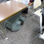 館内放送を机の下で落ち着いてしっかりと聞き、揺れが収まったことを確認して頭上に気をつけながら机から這い出します。