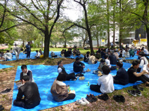 オリエンテーション終了後、昼食はこちらも数年ぶりに近くの公園に移動し、食堂の方が早朝から用意してくださった開講式特製お弁当をいただきました。暖かな日差しの中、生徒、職員、講師で談笑しながら食事をとっている様子を見ながら、これまで中学、高校でも感染予防のため学習面、生活面を含め様々なことが制限されてきたであろう生徒達に今年こそ思い切った一年を過ごしてもらいたいと心から願ったところです。