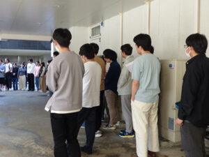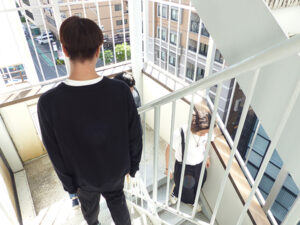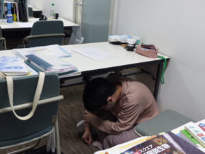 その後、大きな地震が起こり、7階から火災が発生したという想定で避難訓練を実施しました。4階と6階の富士ゼミ生の自習室で地震発生時に机の下に隠れる訓練や、非常階段を各階から手すり側と壁側に分かれて降りる訓練を行いましたが、皆真剣に取り組み、スムーズに訓練を行うことができました。