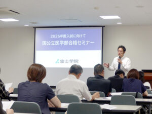 一つ目は例年実施しております「国公立医学部合格セミナー&面接指導」です。今年も国公立医学部合格を目指す多くの受験生と保護者様にご参加いただきました。