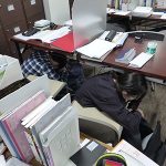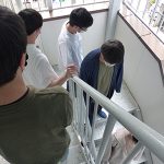 その後、大きな地震が起こり、7階から火災が発生したという想定で避難訓練を実施しました。4階と6階の富士ゼミ生の自習室で地震発生時に机の下に隠れる訓練や、非常階段を各階から手すり側と壁側に分かれて降りる訓練を行いましたが、皆真剣に取り組み、スムーズに訓練を行うことができました。