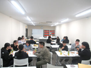 そして後半は懇親会を行い、講師・職員を交えて生徒達と昼食を摂りながら、これまでは生徒同士顔を合わせる程度の関係でしたが談笑する中で生徒同士の距離がぐっと縮まったことを実感しました。生徒の中には一人暮らしの不安や、勉強に関する悩みなど様々な本音を聞かせてくれ、それでも周りには同じ目標を持った仲間がたくさんいて「自分も負けていられない」と良い刺激になったようでした。昼食を食べ終わると早速、授業に向かう生徒たちや自習に励む生徒たちの姿に大変心強さを感じました。