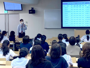 今回の講座では、まず国公立大学医学部と私立大学医学部それぞれの受験状況が数値を基に分析され、その特性について詳しく説明されました。単なるデータの提示だけでなく、過去に多くの合格者がどのような方法で成果を上げてきたか、その具体例を挙げて説明が行われたため、生徒たちは非常に現実感を持って受け止めていました。