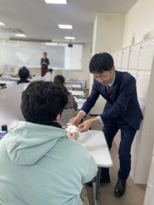 試験本番、ふと不安になったときにこのメッセージを見て、校舎で積み上げてきた時間を思い出してほしい。そんな願いを込めて一袋ずつ手渡ししました。