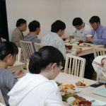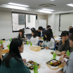 開講式後には、担任となる講師、担当教務と一緒に1階の学院専用食堂から届けられた心のこもったお弁当でのランチタイム。外はあいにくの雨でしたので、計画していた校舎近くの公園ではなく室内での実施でしたが、皆、緊張もほぐれ、笑顔で楽しそうに和気藹々と食事をしていました。