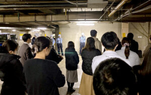 こちらは、校舎が入っているビルの防災訓練。定期的に実施され、防火設備や避難経路の確認などを行います。