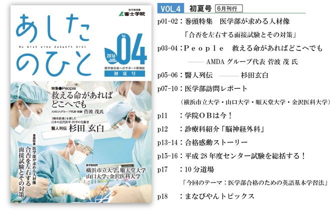 2016年07月27日 医学部合格に向けてのサポート情報誌“あしたのひと”Vol4 無料購読受付中! バックナンバー vol.3(冬号) vol.2(秋号) vol.1(創刊号)“あしたのひと”購読ご希望の方は以下の資料請求フォームよりお申込頂けます。(無料)※申し訳ありませんが同業他社様のお申込はご遠慮ください 2025.04.16 【体験記速報!】兵庫医科大学一般選抜A(四科目型・一般枠)に現役合格した個人指導生R・H君から合格体験記が届きました! 2025.04.16 【体験記速報!】岩手医科大学一般選抜に合格した富士ゼミ生I・K君(3浪)から合格体験記が届きました! 2025.04.15 【保護者の声速報!】藤田医科大学一般入試前期に合格した富士ゼミ生S・H君(2浪)のお母様から感謝の言葉をいただきました! 2025.04.15 【保護者の声速報!】東京医科大学医学科学校推薦型選抜(一般公募)に現役合格した対策指導生S・Sさんのお母様から感謝の言葉をいただきました! 2025.04.15 【体験記速報!】兵庫医科大学医学部一般選抜A(四科目型・一般枠)に合格した富士ゼミ生E・Sさん(2浪)から合格体験記が届きました! 2025.04.15 【体験記速報!】福岡大学医学部医学科一般選抜に合格した富士ゼミ生Y・Mさん(2浪)から合格体験記が届きました! 2025.04.15 【体験記速報!】福岡大学医学部医学科一般選抜に合格した個人指導生K・Iさん(1浪)から合格体験記が届きました! 2025.04.15 【体験記速報!】東京医科大学医学科学校推薦型選抜(一般公募)に現役合格した対策指導生S・Sさんから合格体験記が届きました! 2025.04.14 【保護者の声速報!】岩手医科大学一般選抜に合格した富士ゼミ生N・Mさん(1浪)のお母様から感謝の言葉をいただきました! 2025.04.14 【保護者の声速報!】東海大学医学部医学科一般選抜に合格した富士ゼミ生K・K君(2浪)のお母様から感謝の言葉をいただきました! 2025.04.14 【体験記速報!】福岡大学医学部医学科学校推薦型選抜(地域枠)に現役合格した個人指導生K・Aさんから合格体験記が届きました! 2025.04.14 【体験記速報!】久留米大学医学部医学科前期一般選抜に合格した富士ゼミ生N・Y君(1浪)から合格体験記が届きました! 2025.04.14 【体験記速報!】近畿大学医学部一般選抜(前期)に合格した富士ゼミ生H・O君(1浪)から合格体験記が届きました! 2025.04.14 【体験記速報!】奈良県立医科大学学校推薦型選抜(緊急医師確保特別入学試験)に合格した富士ゼミ生K・Uさん(2浪)から合格体験記が届きました! 2025.04.10 【保護者の声速報!】鳥取大学医学部医学科一般選抜(前期日程)に現役合格した個人指導生K・Yさんのお母様から感謝の言葉をいただきました! < 12 13 14 15 16 17 18 19 20 21 22 23 24 25 26 >