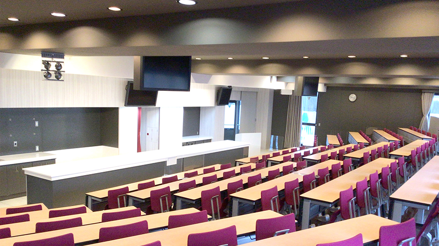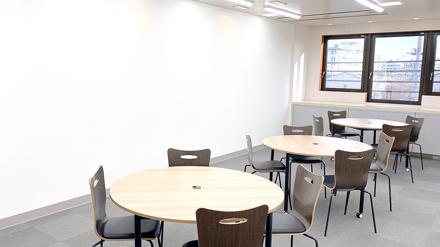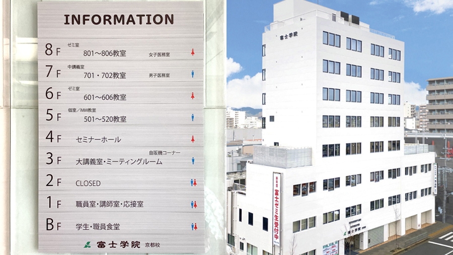 富士学院京都校は、関西地区2校目として2021年に開校しました。9階建ての校舎内には、通学生も利用できる学院専用の食堂があり、毎日3食が提供されています。また、校舎のすぐ近くには寮も完備しており、一棟丸ごと医学部受験の学習環境として整備されています。